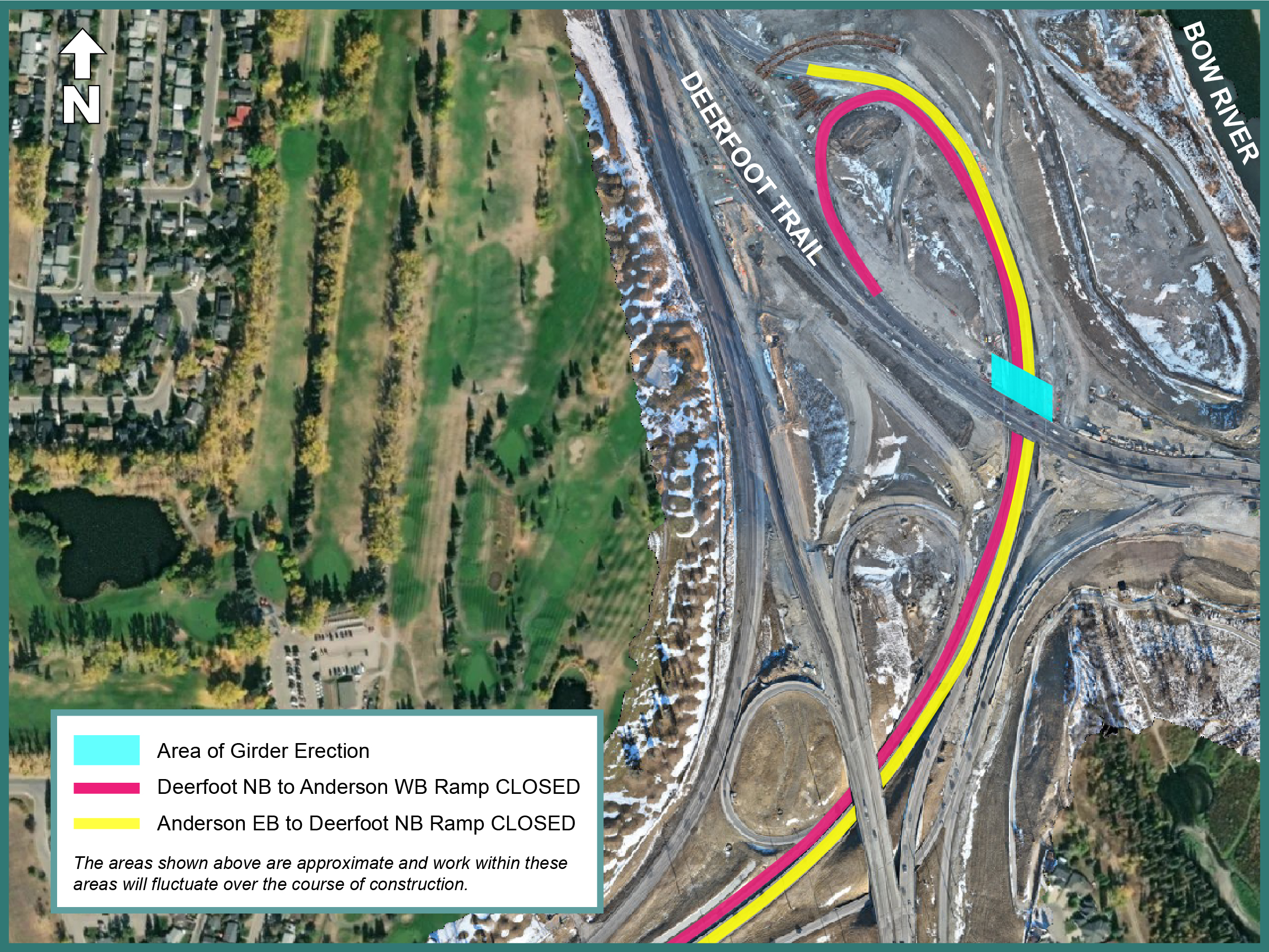 The on-ramps from Anderson Road SE and Bow Bottom Trail SE to northbound Deerfoot Trail will be temporarily closed to accommodate critical construction activities for the new northbound bridge. To safely complete girder erection, a large crane must be positioned and operated within the on-ramps. For the safety of workers and the public, these ramps must be fully closed during the lifting of girders overhead. Please see the map below.